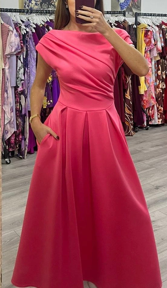 Betty Fuchsia Asymmetric Neckline Skater Maxi Dress With Pockets (PRE-ORDER TO SHIP IN FEBRUARY)