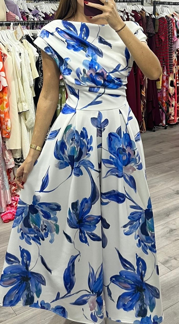 Kirsty Cobalt Blue Banded Pleated Long Sleeve Maxi Dress