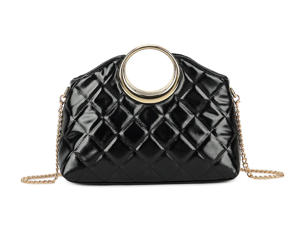 Sicily Quilted Patent O-Ring Handle Bag - Black