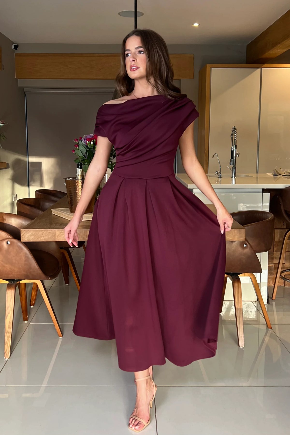 Experience modern elegance with the Betty Burgundy Plum Asymmetric Neckline MidaxI Dress - a classic, statement piece crafted from the highest quality materials for a luxurious feel. Its unique asymmetric neckline provides visual interest, while the sleek pleated waist skater skirt silhouette flatters the figure, creating an exquisite look that will never go out of style. The best bit? It has pockets!!