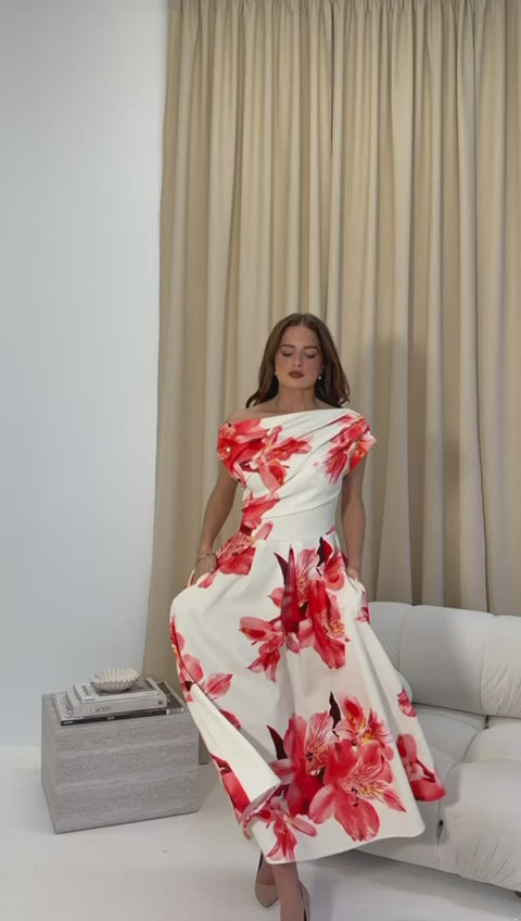 Betty Orange Floral Asymmetric Neckline Skater Maxi Dress With Pockets