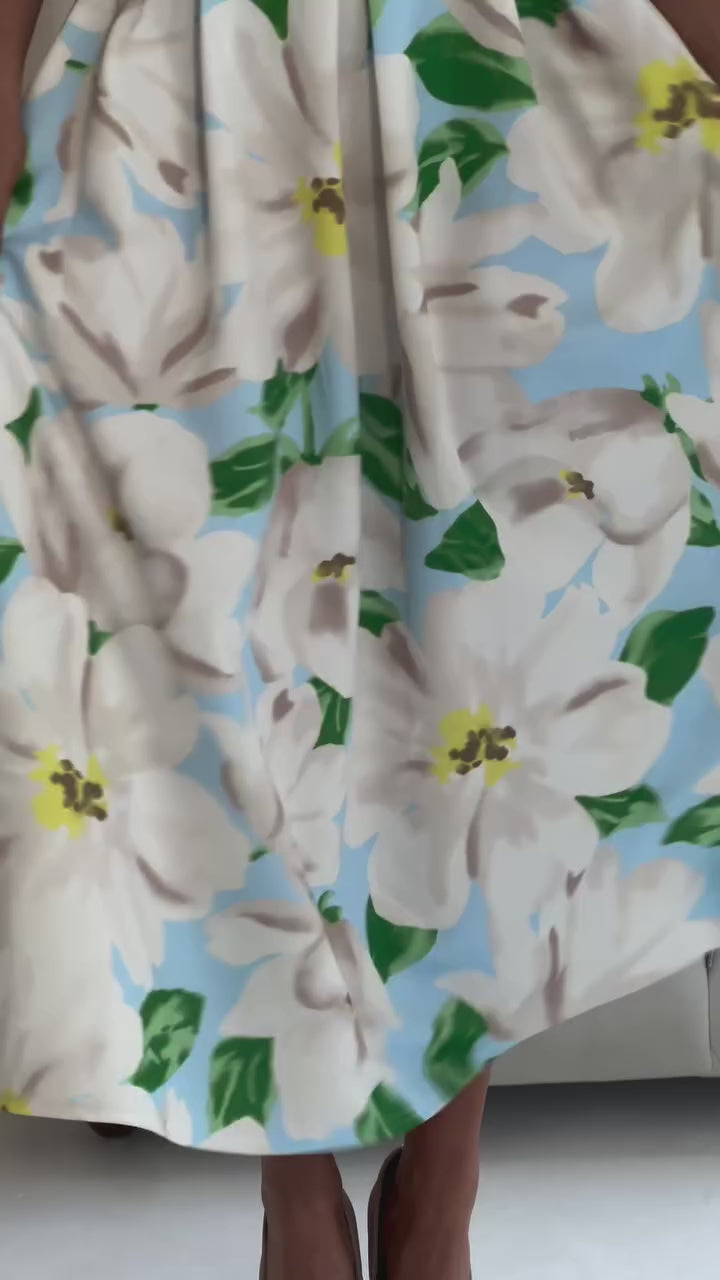 Betty Pale Blue & Green Floral Asymmetric Neckline Skater Midi Dress With Pockets