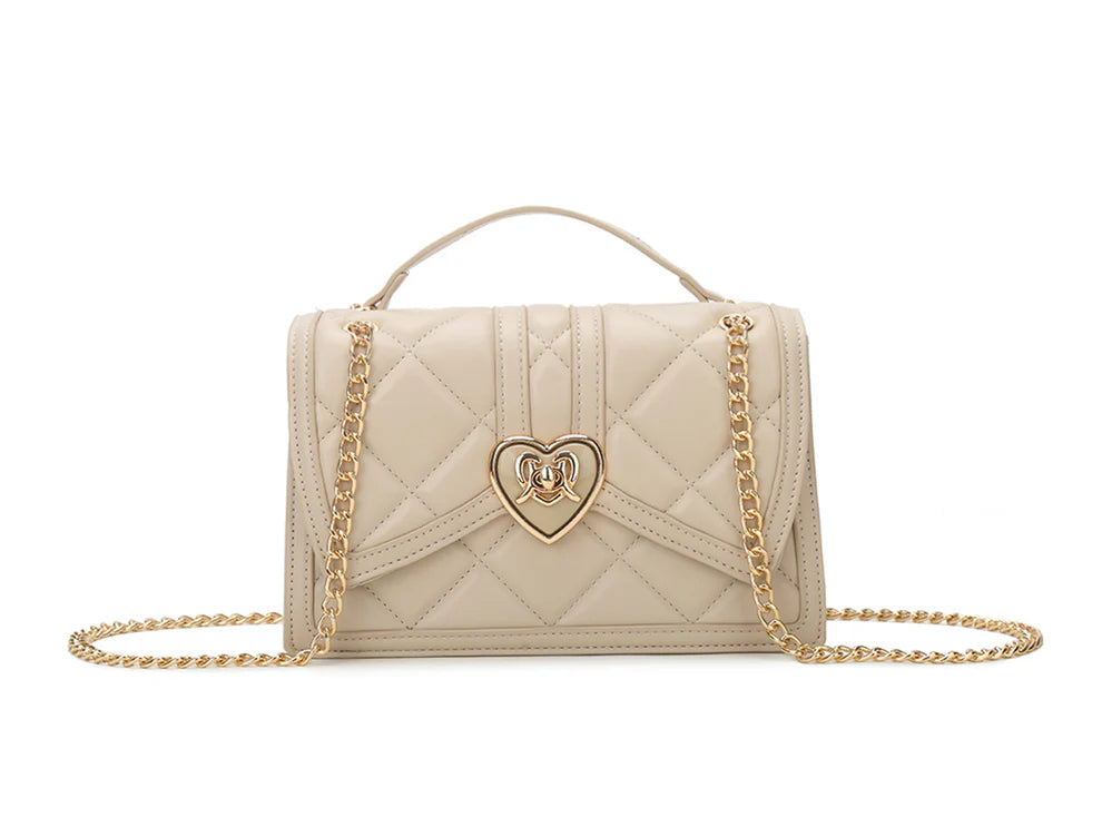 Nude/Beige Quilted Faux Leather Cross Body Shoulder Bag with a lovely heart shape clasp & gold chain