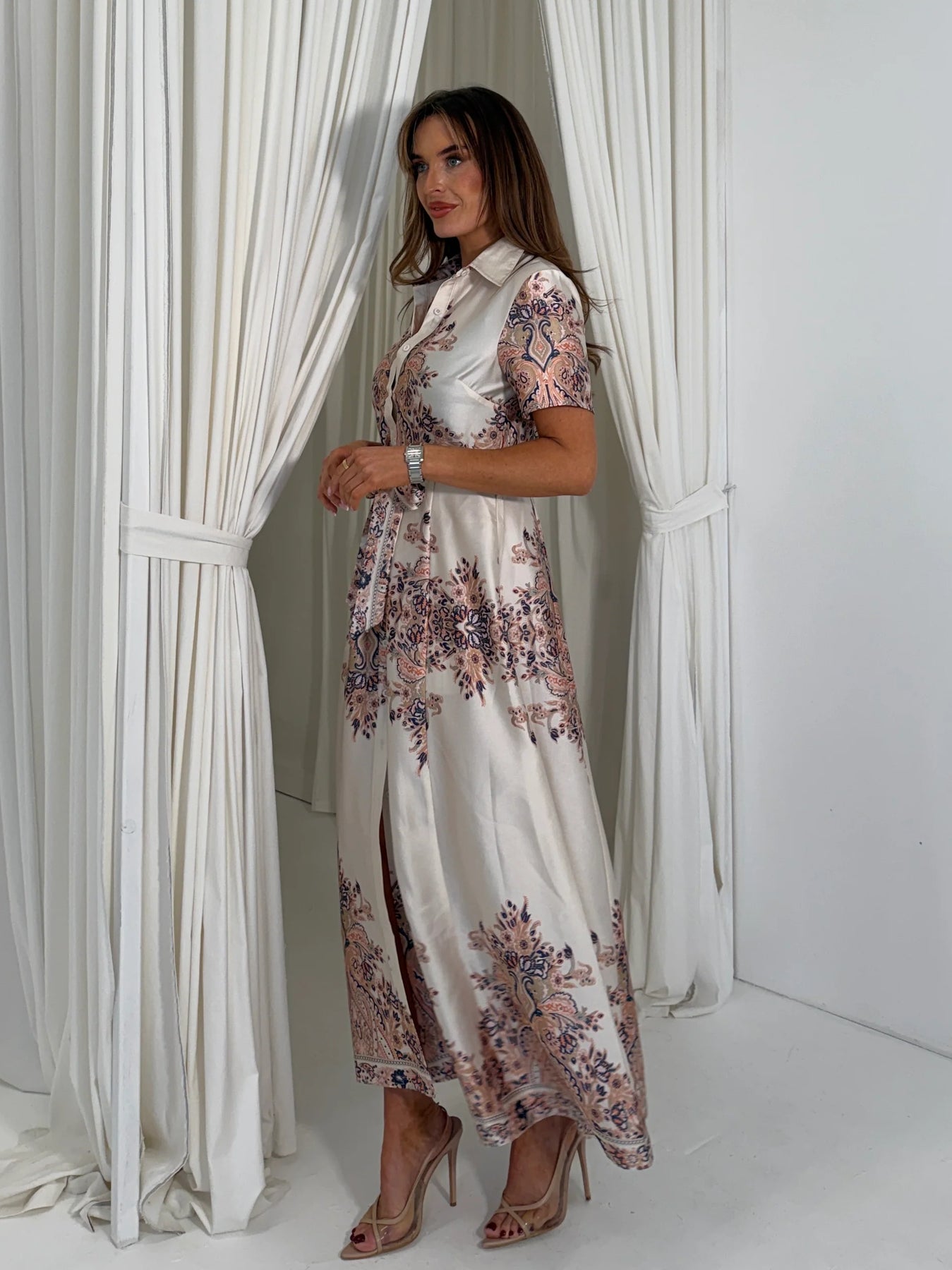 Aurora Ivory Paisley Print Belted Maxi Shirt Dress