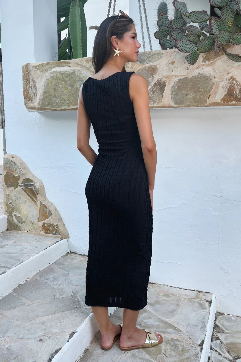 Britney Black Textured Asymmetric Neckline Bodycon Midi Dress